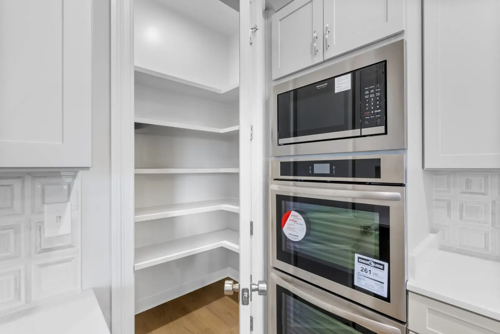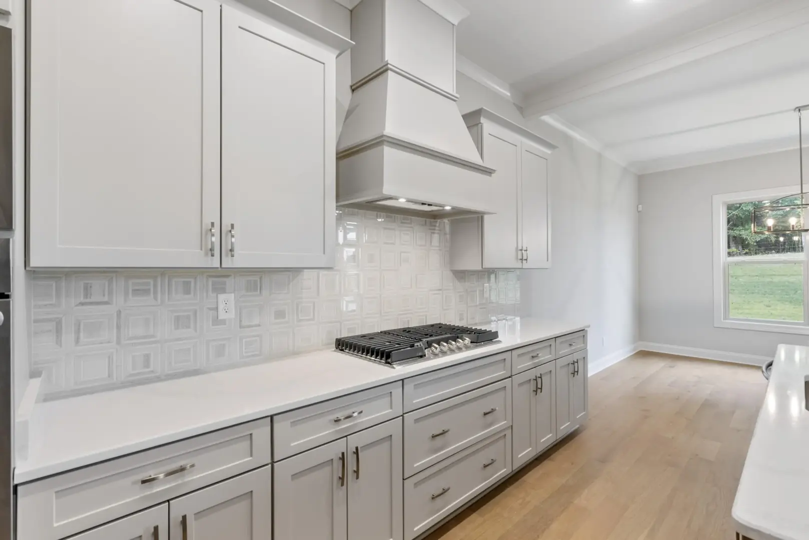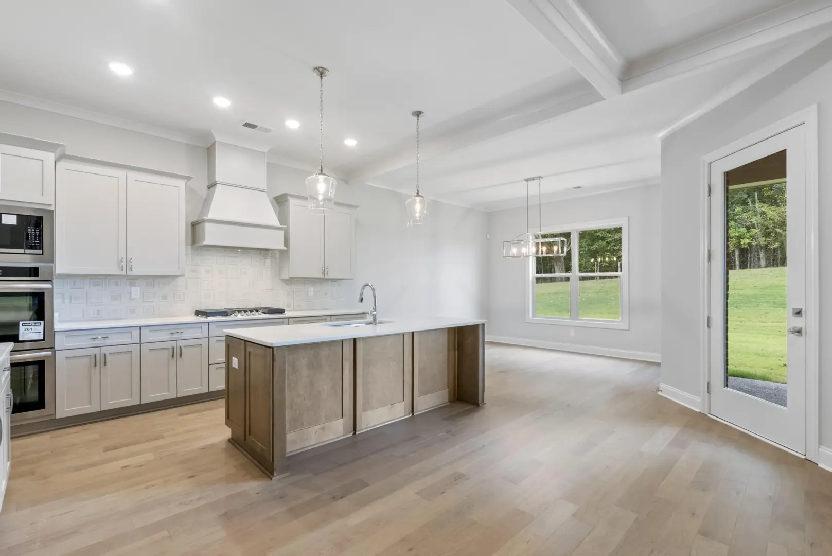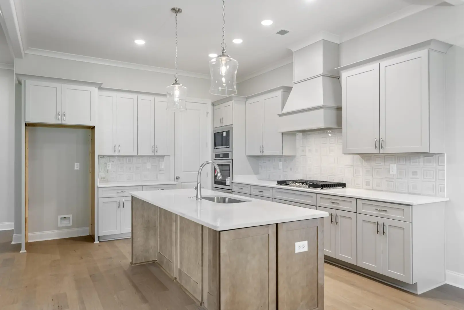 Open-concept kitchen with 5-burner cooktop, double ovens, quartz counters, and soft-close cabinets